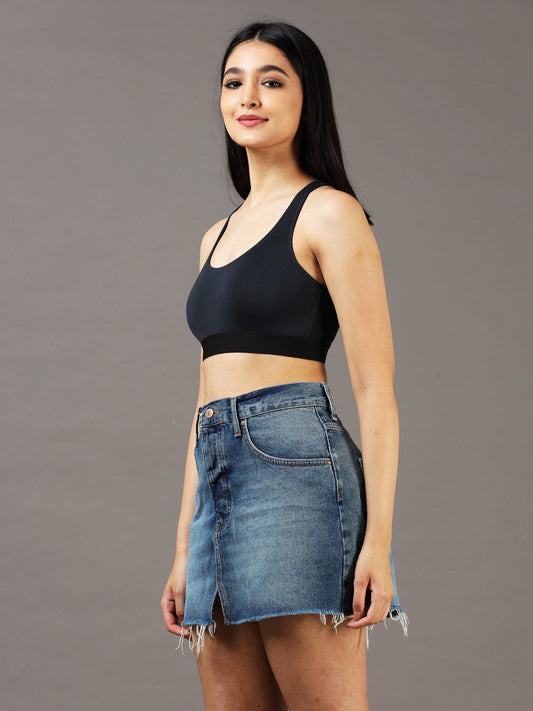A women’s sports bralette layered with a denim jacket or denim shirt is the perfect mix of sporty and casual. Pair with jeans, shorts, or even a denim skirt for a coordinated look. This is a timeless combination that’s practical, relaxed, and can be styled for any season.